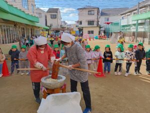 最初は先生がこねこねして、そのあとみんなでお餅をついたよぉ~